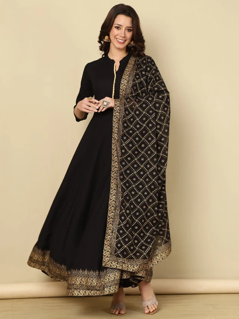 The Black Anarkali Kurti Set blends traditional beauty with modern charm. The Anarkali silhouette has deep roots in royal Indian fashion, symbolising grace and sophistication. Its flowing shape honours age-old craftsmanship while the classic black colour adds a contemporary appeal. This makes the outfit perfect for celebrations where culture and style come together.