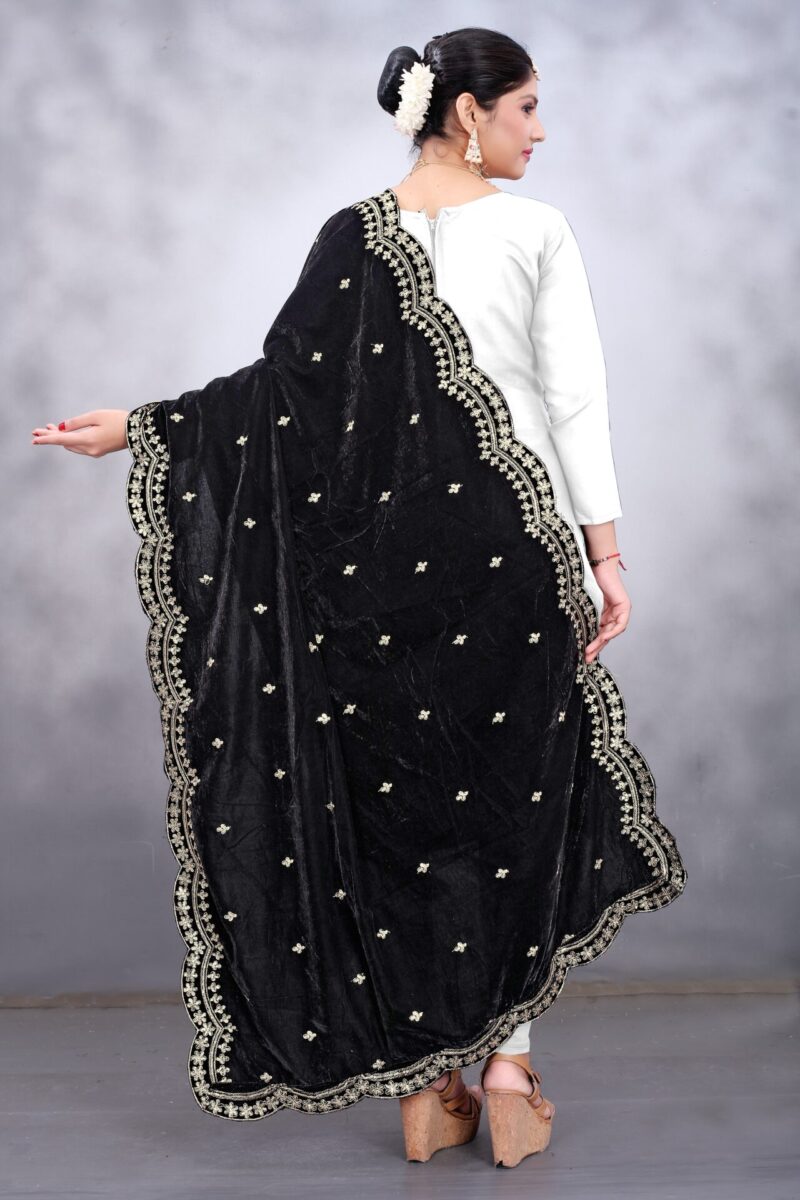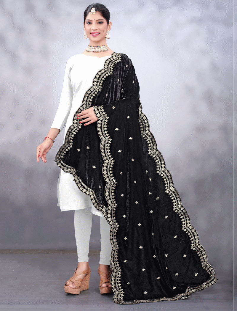 This black embroidered velvet stole is a fine example of craftsmanship and luxury. Here are the key product details:- Fabric: High-quality velvet that feels soft and luxurious.