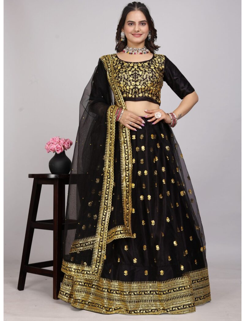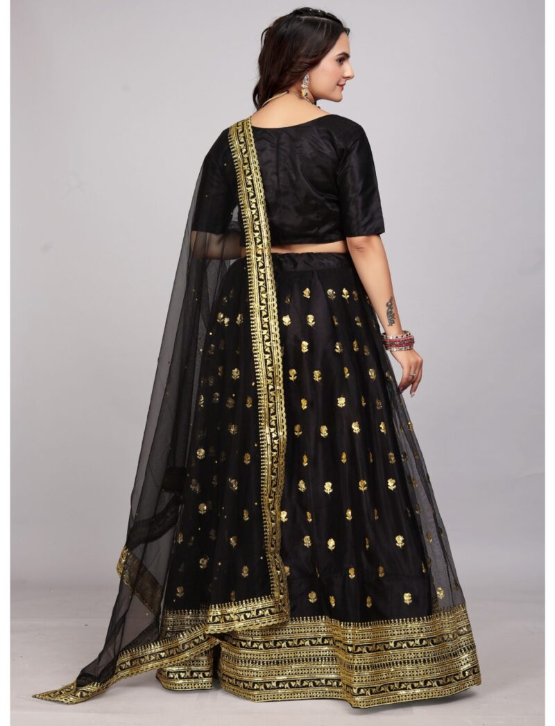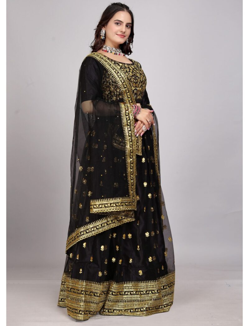 The black color of this lehenga choli exudes elegance and sophistication. Black is a timeless and versatile shade that complements various skin tones and is perfect for both day and night events. The rich hue, combined with the intricate embroidery and sequins work, creates a visually stunning outfit that is sure to turn heads. This color choice not only reflects confidence but also adds a touch of mystery and allure to your look.