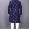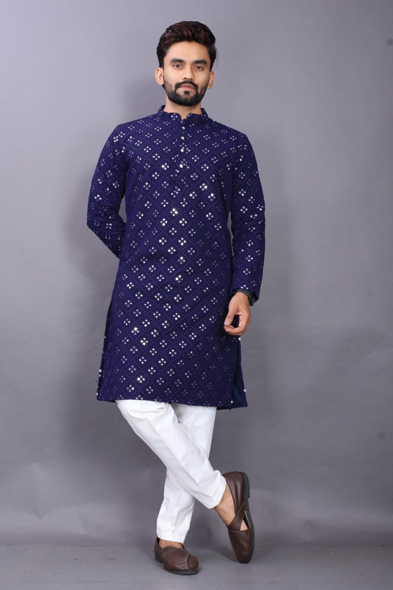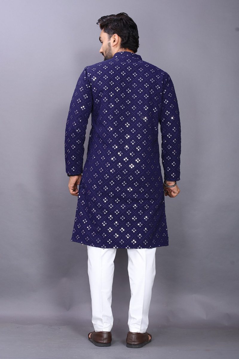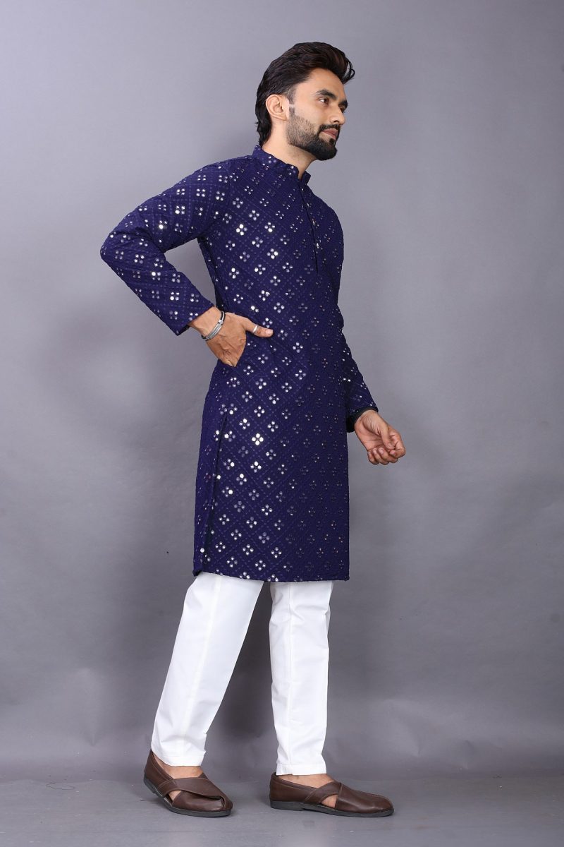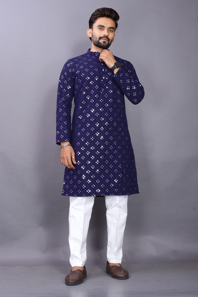Made with soft georgette fabric, this kurta pajama ensures comfort during long celebrations. The deep blue shade represents calmness and royalty. Intricate mirror detailing across the kurta enhances its festive look, while the pajama maintains a clean, tailored finish.