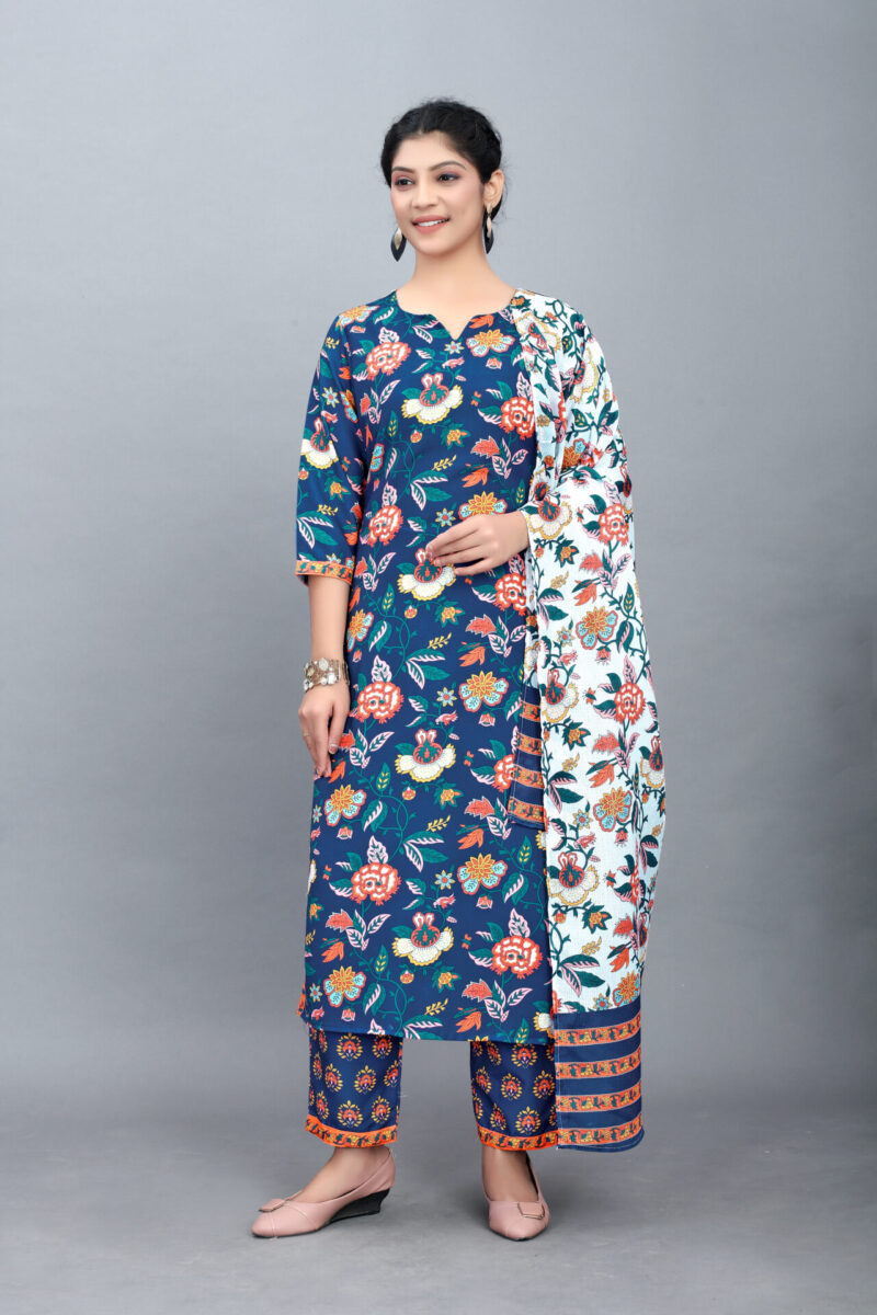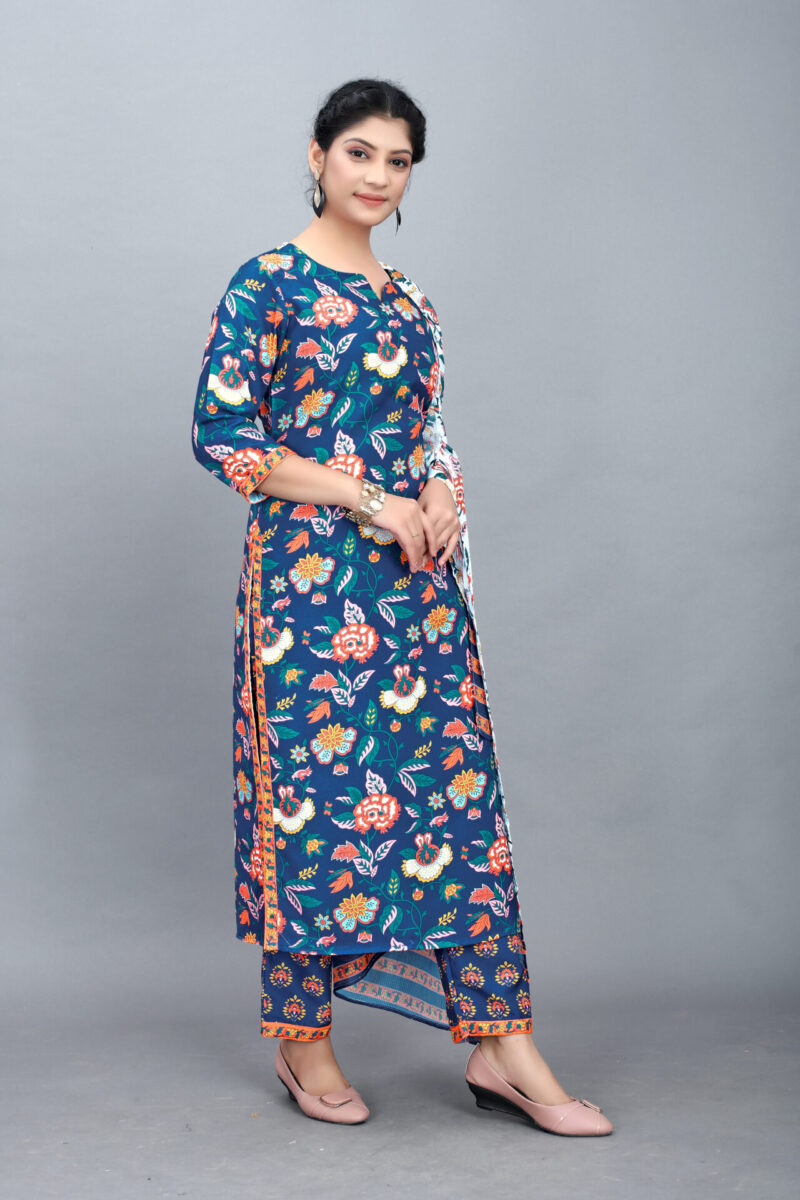 Blue symbolizes tranquility and elegance. This kurti set’s striking blue shade is universally flattering and adds a refreshing touch to your ethnic wardrobe.Styling and Pairing Suggestions