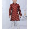 Maroon kurta with all-over contrast prints. Paired with an churidar.