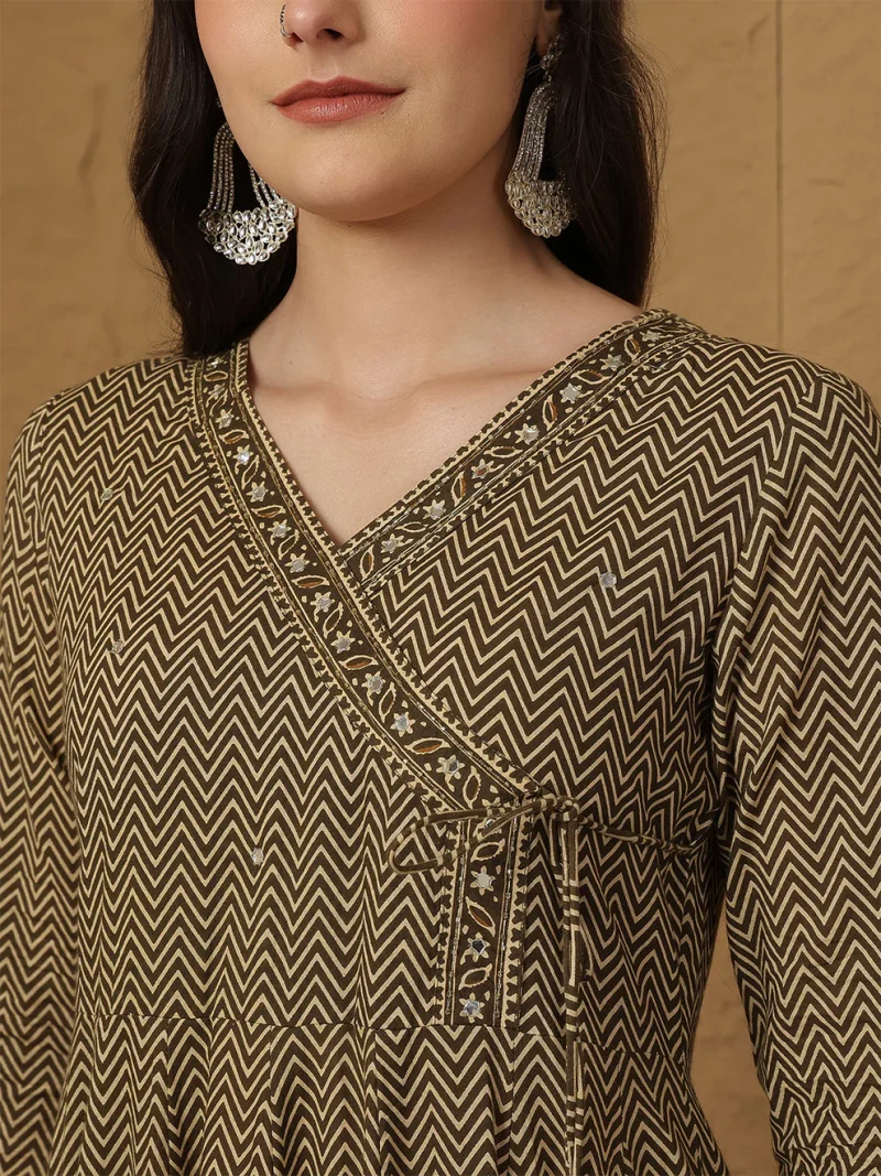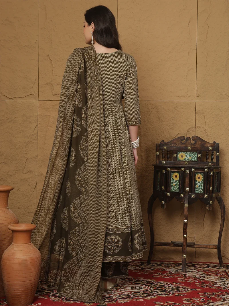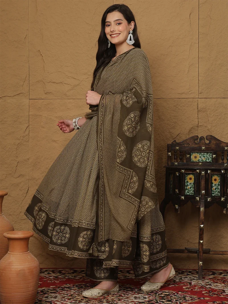 The Brown Cotton Anarkali Kurti Set reflects a classic charm rooted in India’s rich textile heritage. The Anarkali silhouette has been cherished for centuries due to its graceful flare and regal flow. Brown symbolizes stability and earthiness, making this attire both calming and sophisticated. This set blends traditional artistry with modern comfort, creating a timeless look for women who value culture and style.