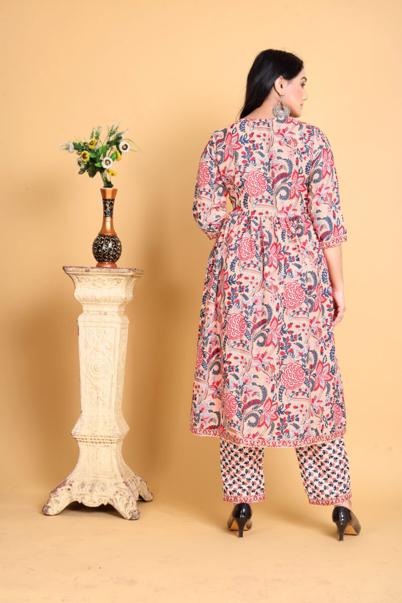 This kurta pant set reflects India’s rich heritage of floral prints and traditional craftsmanship. Its A-line silhouette and flared hem echo timeless styles while offering a contemporary appeal.Occasions to Wear the Cotton Printed Kurta Pant Set