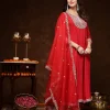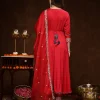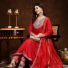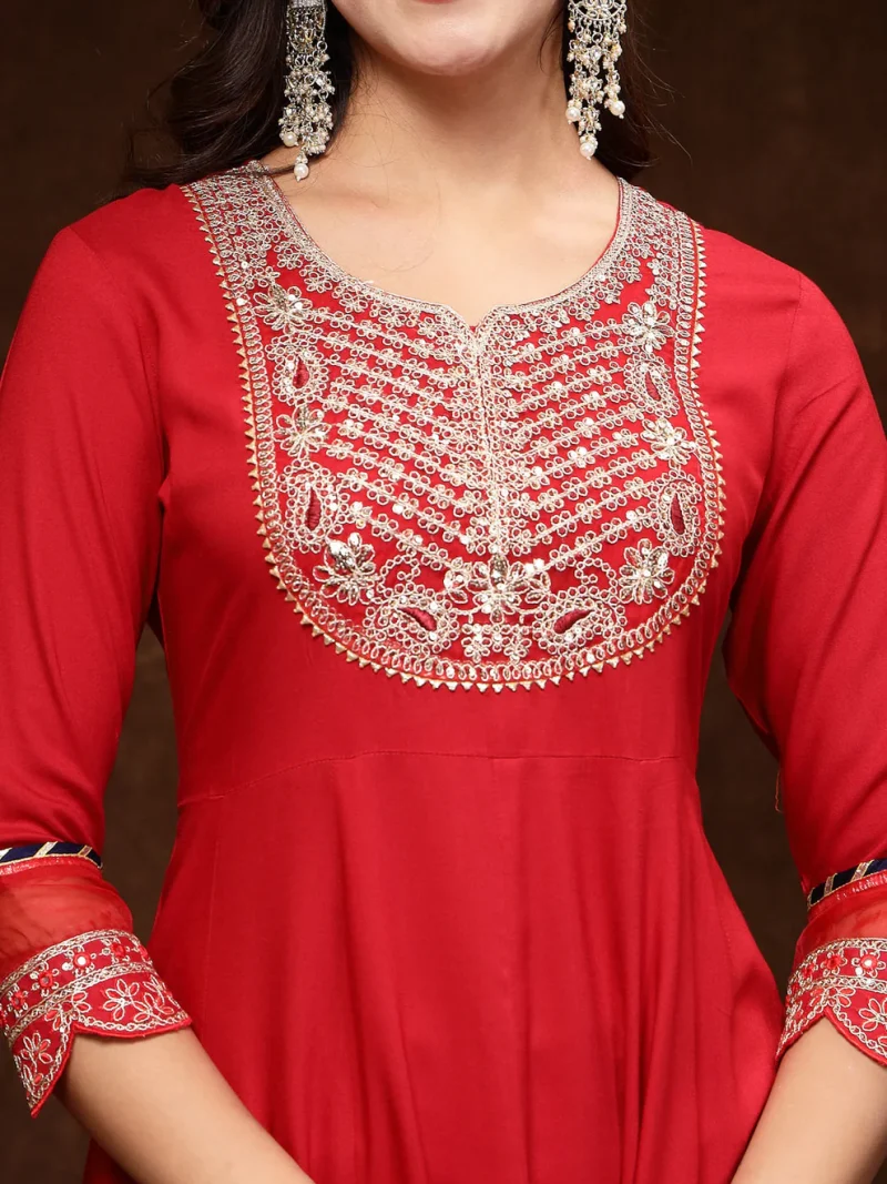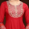Crafted in radiant red, this Anarkali is made from premium rayon fabric. Rayon ensures breathability and comfort while maintaining a luxurious drape. The detailed embroidery elevates its beauty, giving the outfit both richness and versatility.