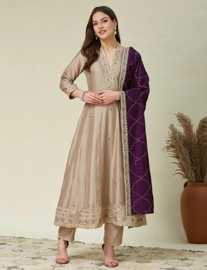 The Embroidered Silk Anarkali Kurti Set is rooted in timeless heritage and royal elegance. Its flowing silhouette reflects Mughal-inspired fashion, while the embroidery showcases skilled artistry passed through generations. Moreover, The golden colour symbolises prosperity and warmth, making it ideal for auspicious celebrations. Furthermore, Together, these elements create an outfit that carries emotional depth and cultural pride.
