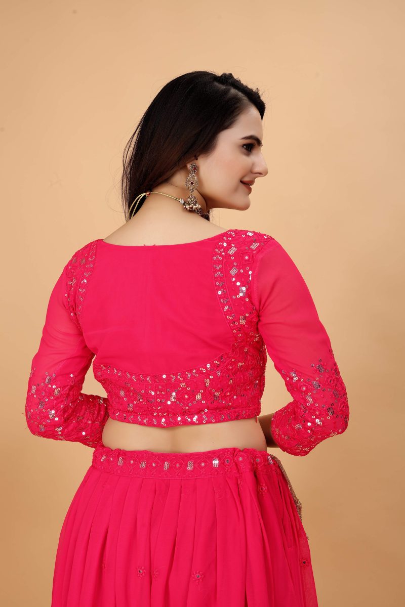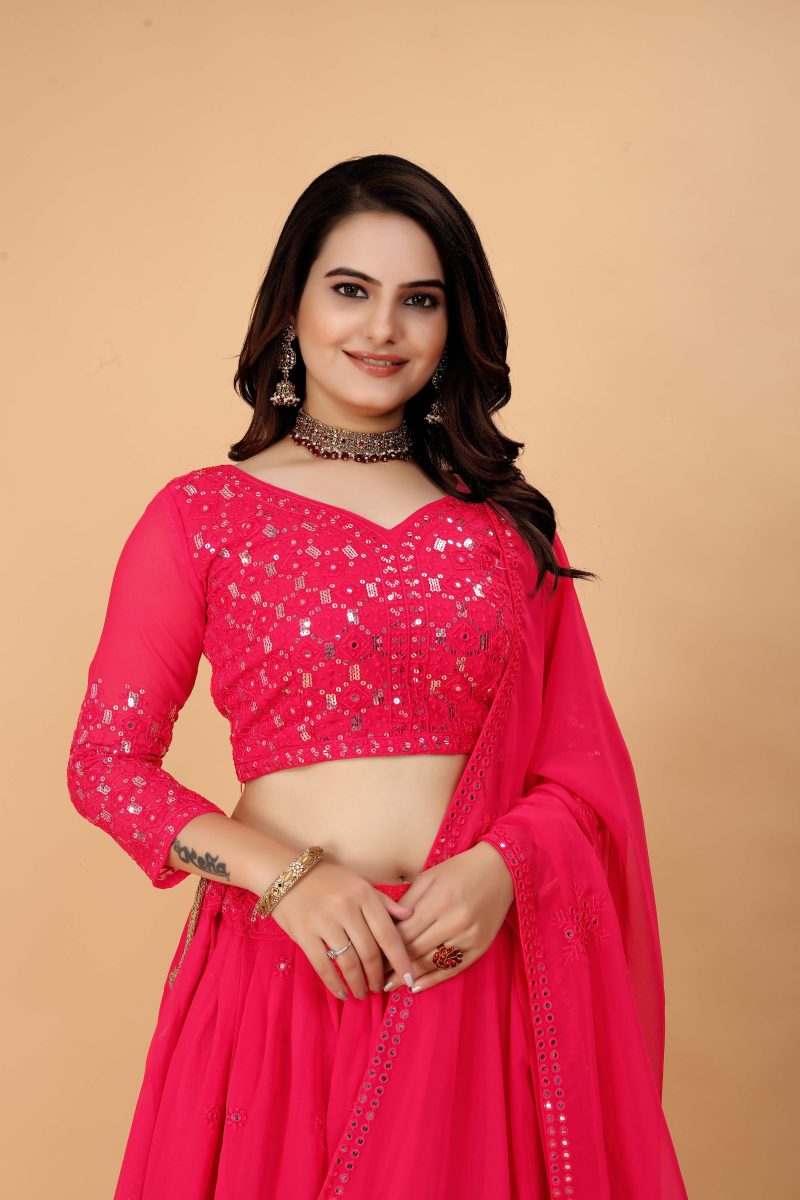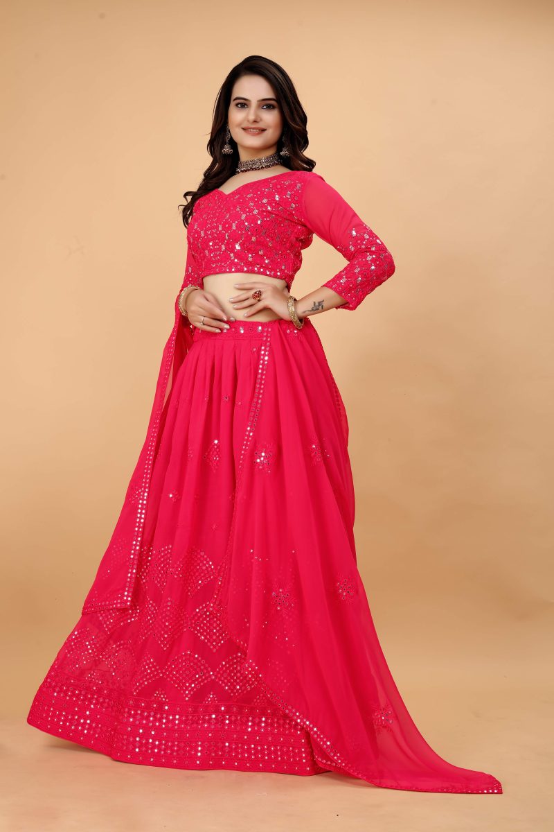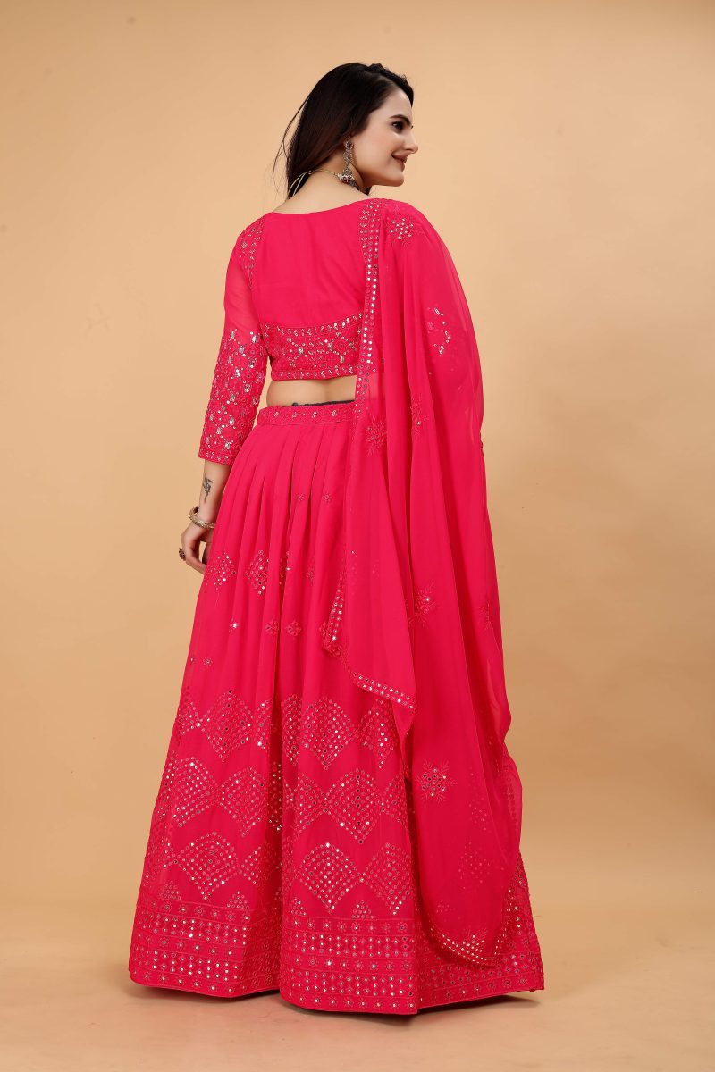 This attire serves as a glamorous ode to party seasons, providing a perfect blend of tradition and trendiness. Whether it's a wedding celebration, a festive gathering, or a social soirée, the pink mirror worked georgette lehenga choli ensures you stand out with elegance and grace.