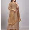 The golden beige color of this lehenga exudes elegance and sophistication. Beige is a versatile shade that complements various skin tones and is perfect for both daytime and evening events. The subtle yet rich hue, combined with the intricate work and luxurious fabric, creates a visually stunning outfit that is sure to turn heads. This color choice reflects confidence and grace, making you feel like royalty.