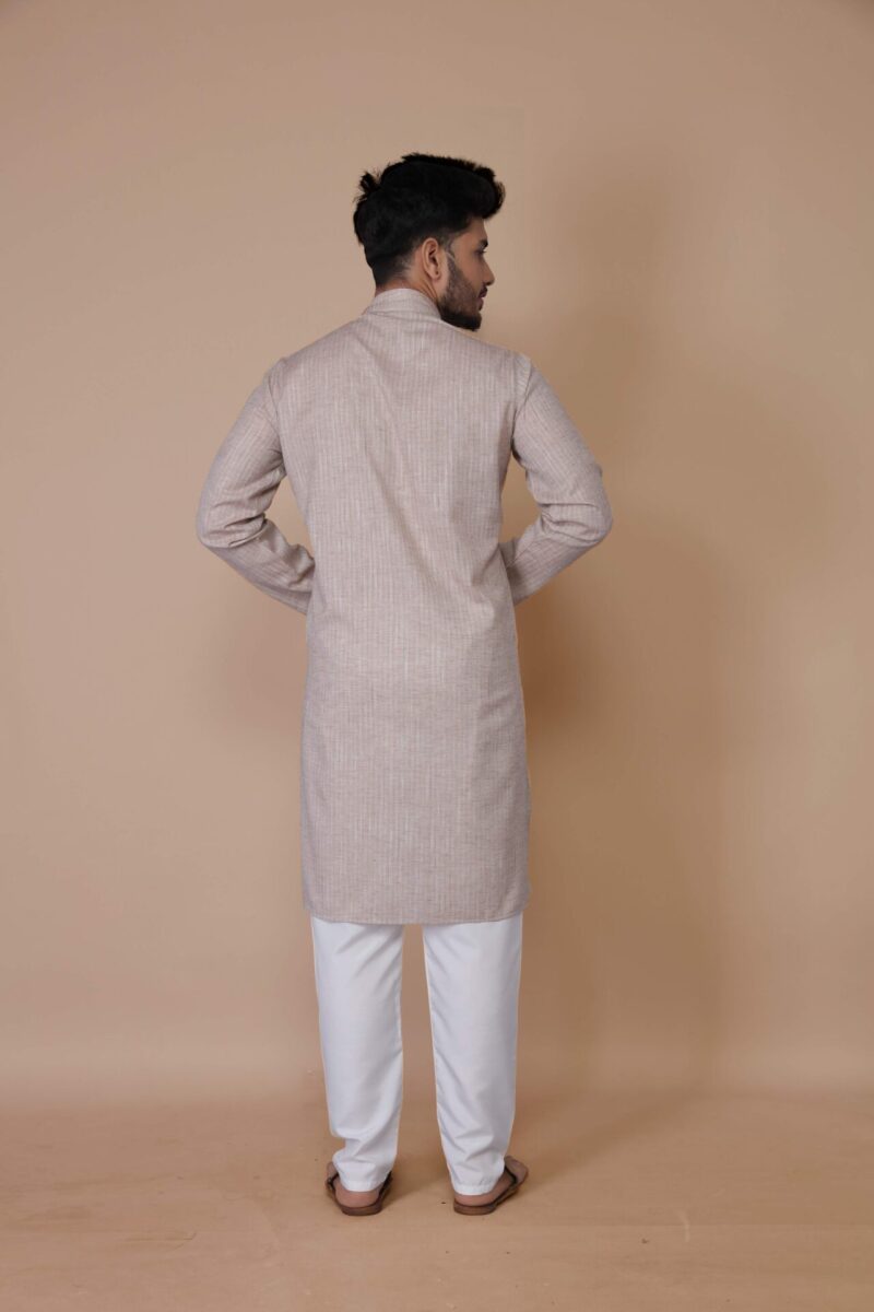 The golden cream cotton kurta pajama stands as a quintessential piece of ethnic wear, blending tradition with contemporary style. Crafted from premium cotton fabric, this attire offers both comfort and sophistication, making it a favored choice for various occasions.The Ethnic Traditional Beige Mens Cotton Kurta Pajama is a Versatile Attire Suitable for Various Occasions: