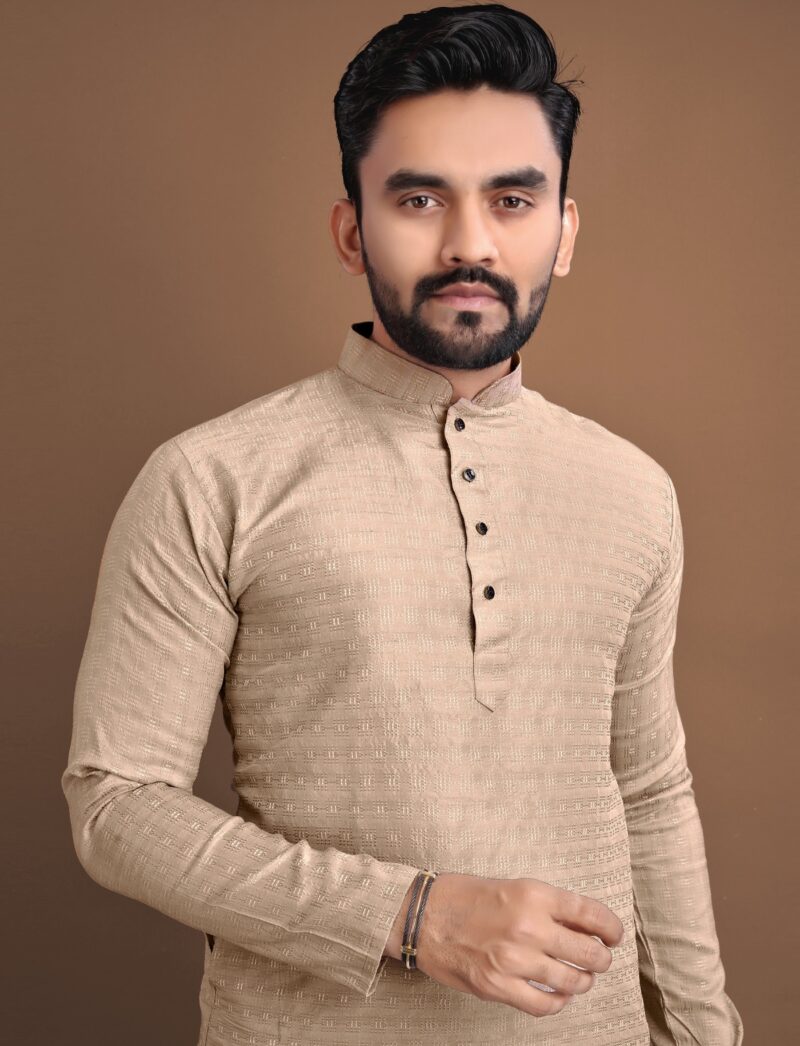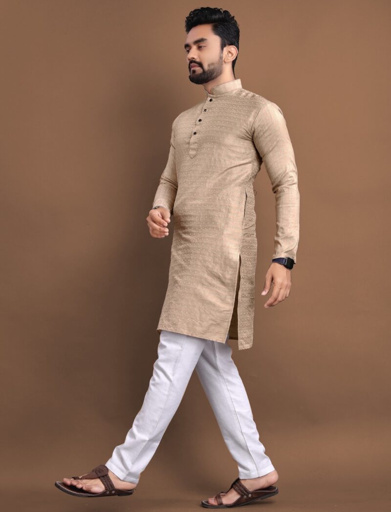 The Golden Self-Printed Kurta Pajama for men is more than just an outfit; it's a celebration of tradition, craftsmanship, and style. Embrace this stunning attire and make a statement at your next special occasion.