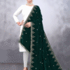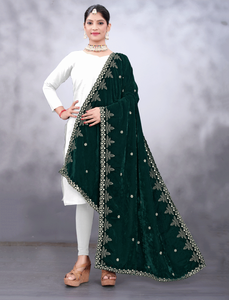 This green embroidered velvet Phulkari stole is a fine representation of elegance and tradition. Here are the details:- Fabric: Premium velvet that feels soft and luxurious.
