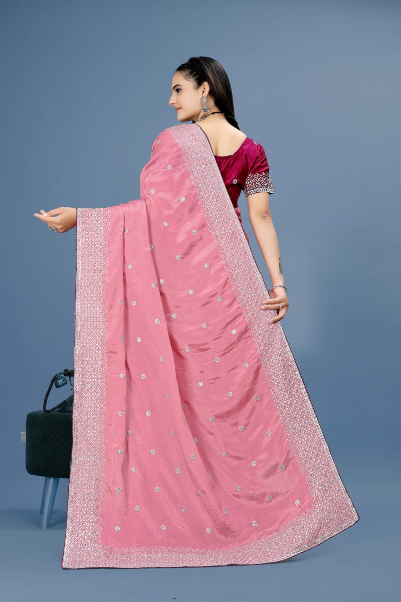 Keywords: Indian style saree, festive glamour, traditional attire, cultural celebrations, pink party saree, radiant fashion, Pure Chinnon Crepe silk saree, stone work embellishments, silver embroidery, saree shop.