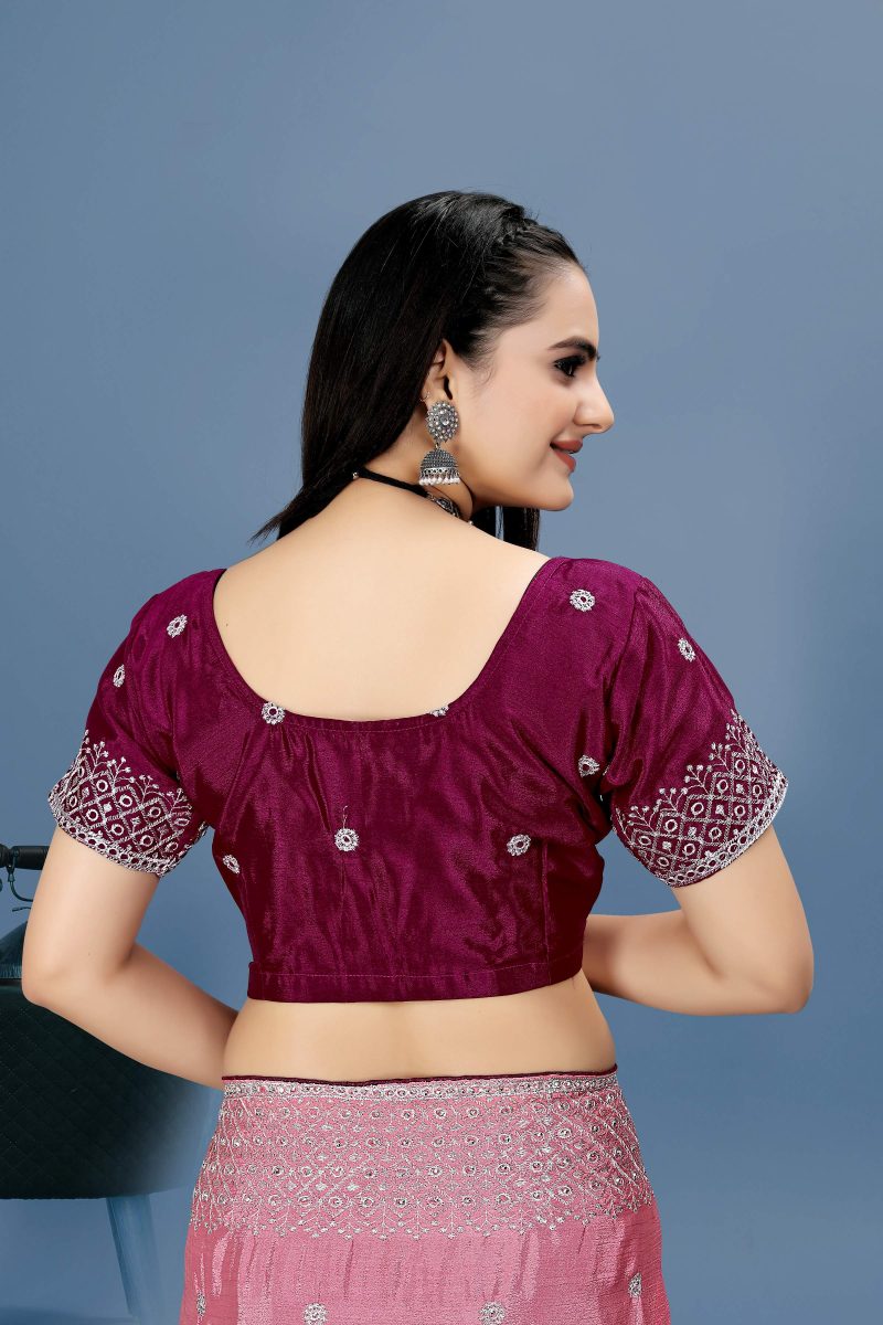 Description: Embrace the vibrant spirit of Indian traditions and immerse yourself in festivities with our Indian Style Pink Saree. Whether it's a grand celebration, a cultural event, or a joyous occasion, this saree will make you the center of attention. The rich pink color, complemented by the Pure Chinnon Crepe fabric and intricate stone work, captures the essence of Indian artistry. Feel the luxurious fabric drape you in comfort while the dazzling silver embroidery adds a touch of glamour to your presence, leaving a trail of admirers wherever you go. Visit our saree shop to experience the opulence in person.