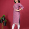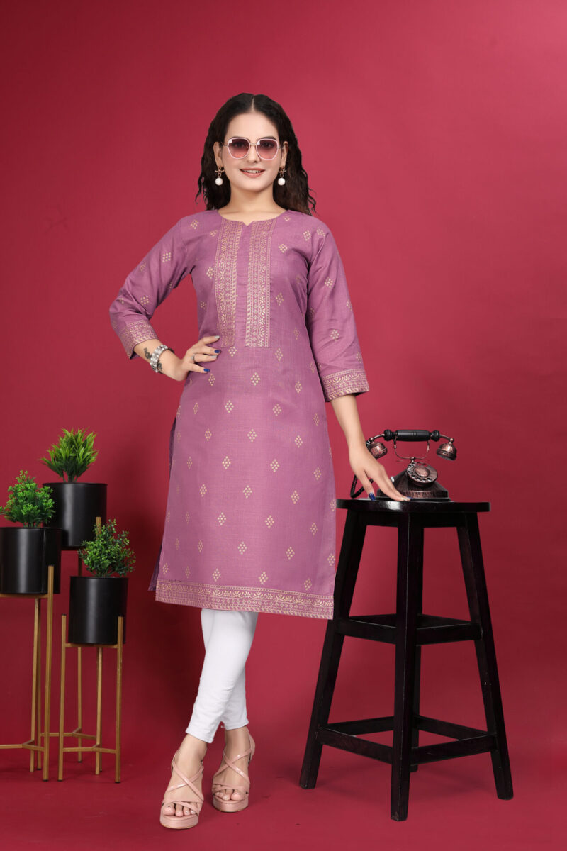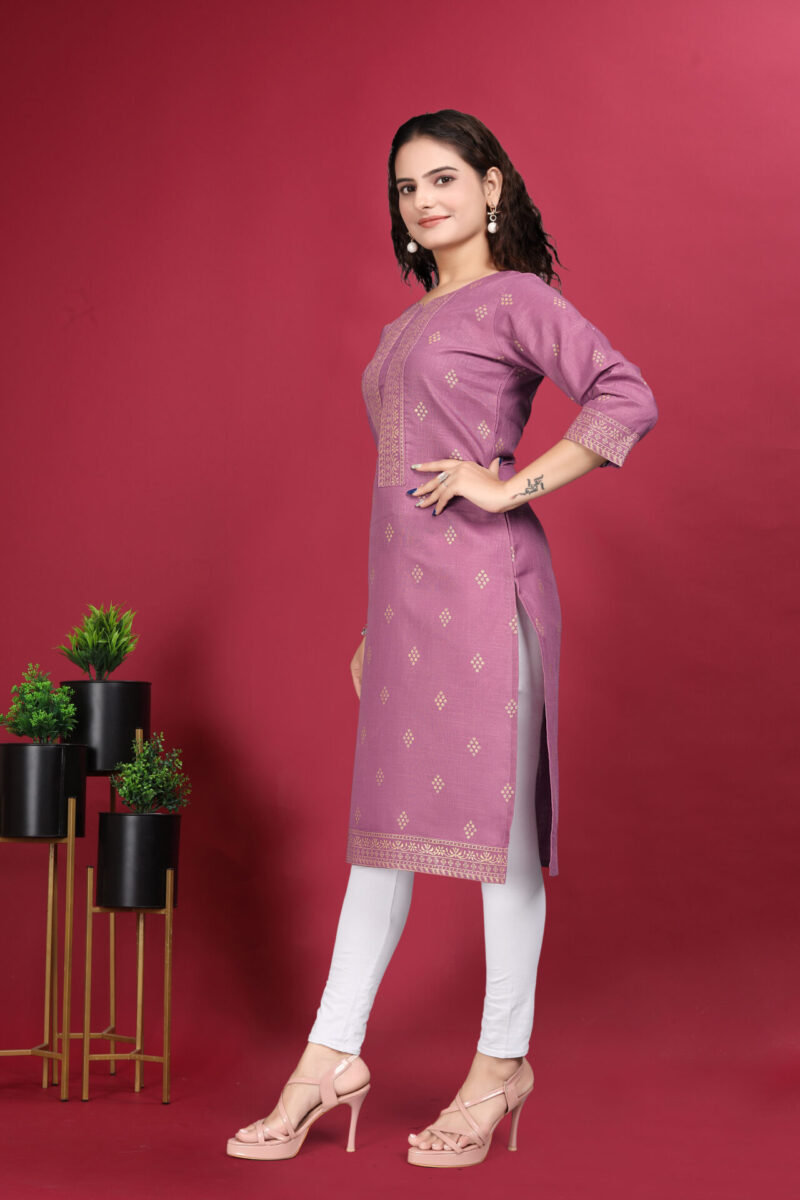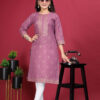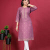 lavender/mauve color sets this kurti apart from more common shades. Lavender is a symbol of elegance and femininity, and this delicate color adds a refreshing touch to any wardrobe. It’s a hue that complements a wide range of skin tones and stands out for its subtle sophistication.