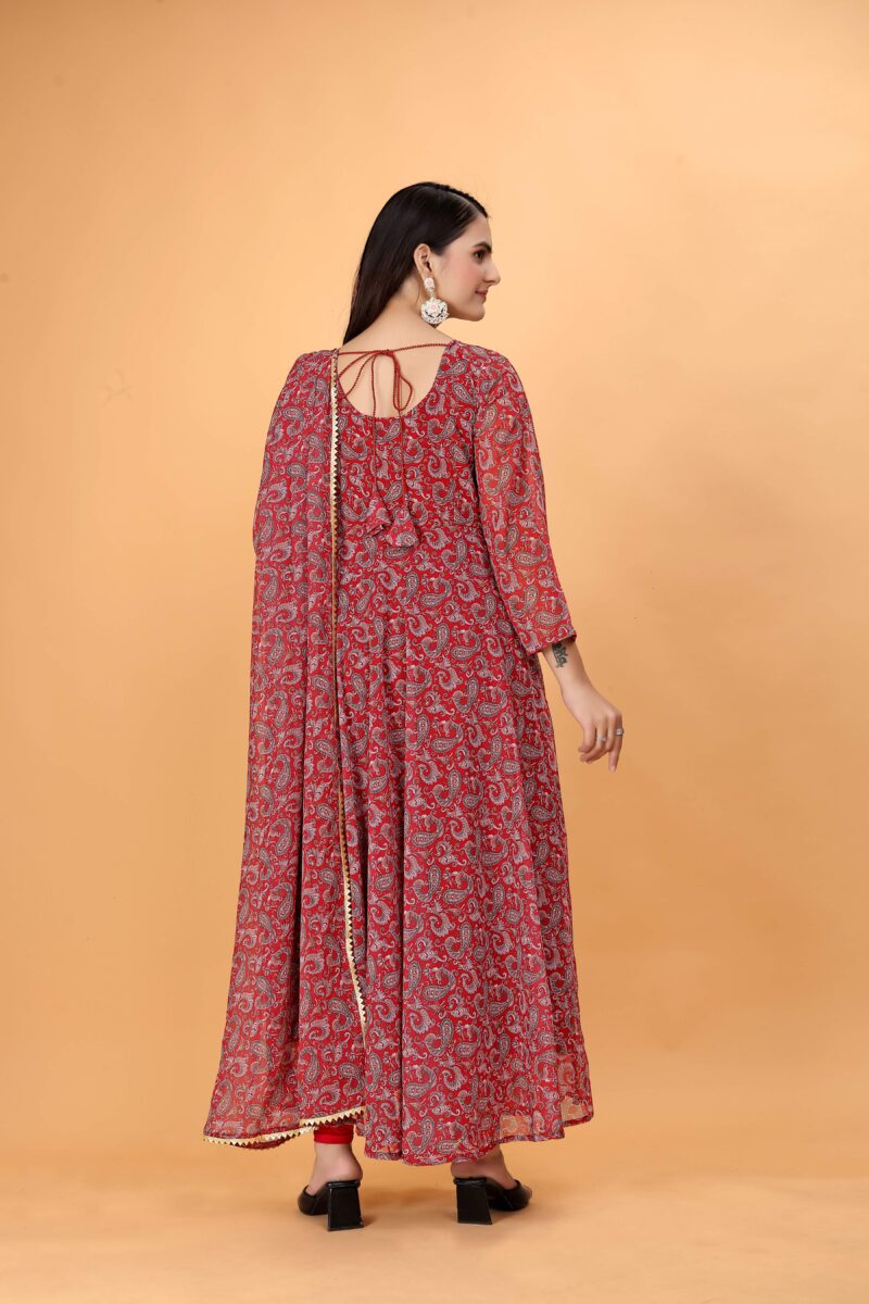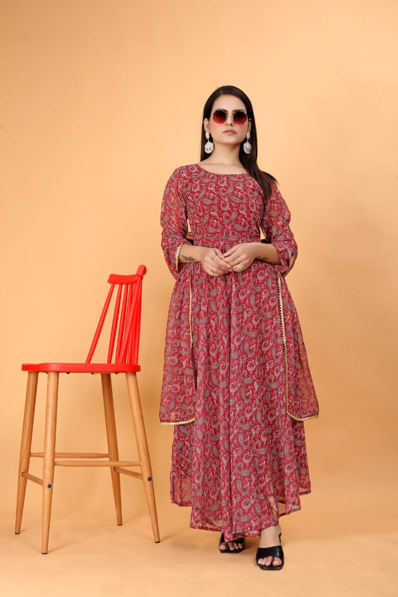 Who says ethnic wear is reserved for special occasions? The Maroon Anarkali Floral Printed Suit with Dupatta effortlessly transitions into everyday casual wear. Also, Its comfortable georgette fabric ensures ease of movement, making it perfect for running errands, casual outings, or social gatherings.