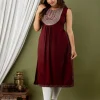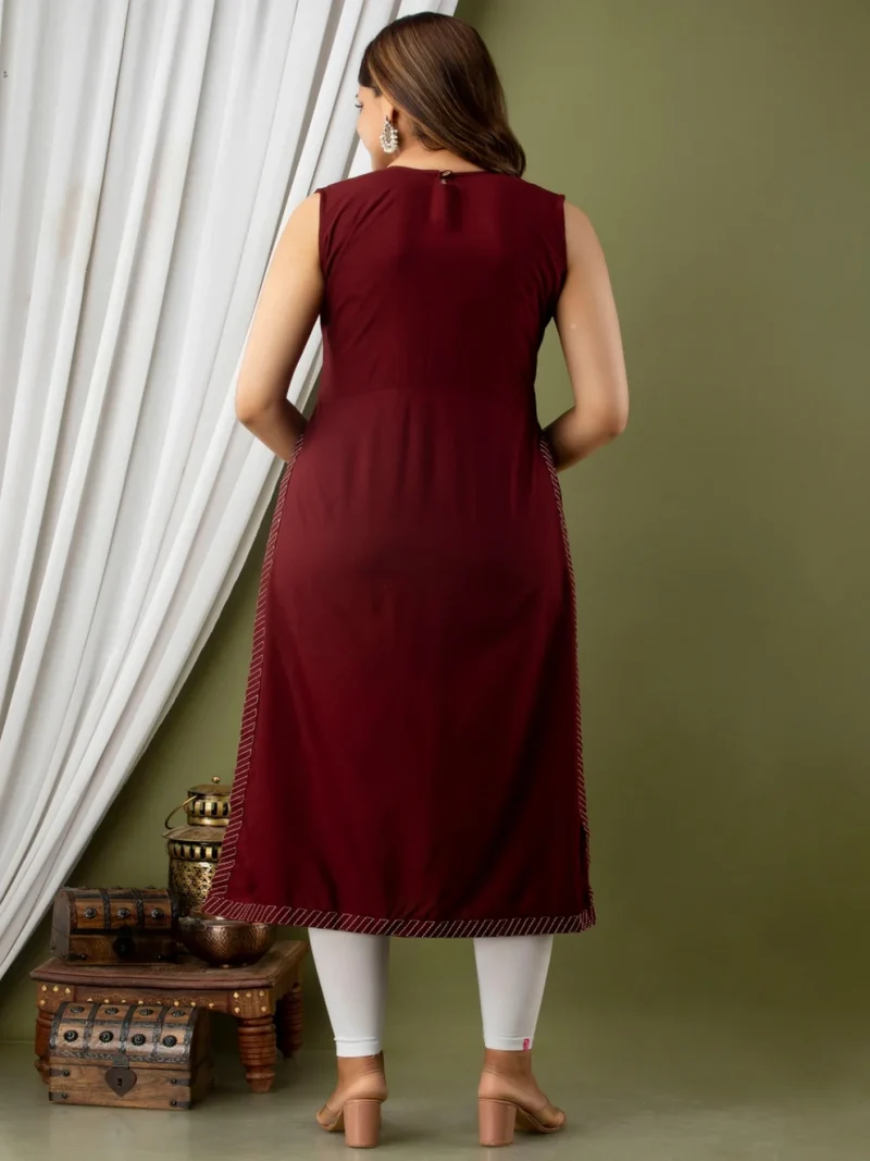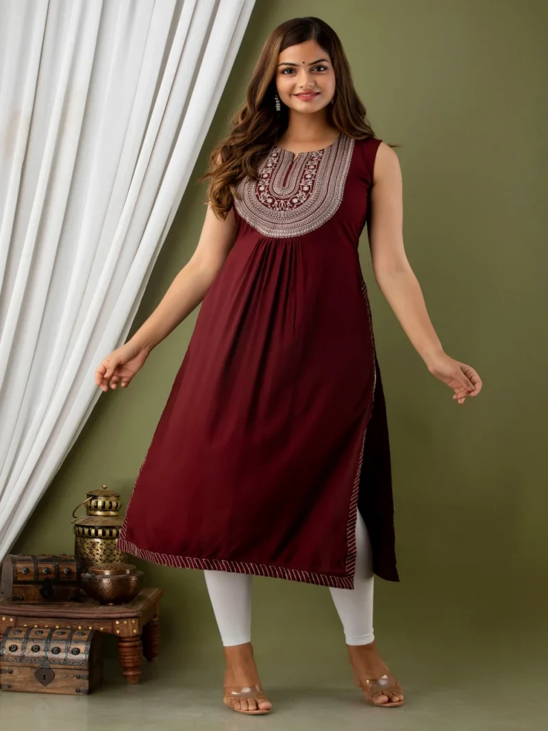 Stay cool and chic under the summer sun. The airy rayon fabric makes this kurti ideal for hot days. Its sleeveless cut ensures breathability, while the maroon hue adds a bold splash of color. Whether you’re attending a brunch, shopping, or enjoying a coastal getaway, this kurti keeps you stylish without compromising comfort.
