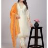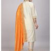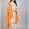 The off-white color of the kurta set is timeless and elegant. Off-white, a neutral shade, is versatile and can be paired with various accessories and footwear. This color exudes a sense of calmness and grace, making it suitable for both day and evening events. Its subtlety allows the vibrant orange dupatta to stand out, creating a striking contrast that is sure to turn heads.