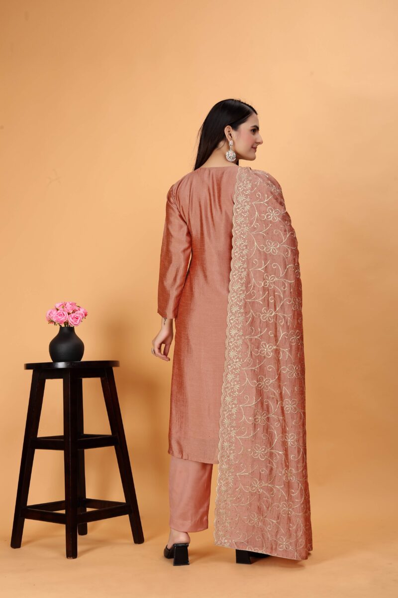 In the vibrant tapestry of Indian fashion, the Peach Punjabi Salwar Suit Traditional stands out as an epitome of grace and tradition. Its intricate embroidery work, especially in Blush Pink and Copper colors, has made it the perfect outfit for celebrations like Eid, Diwali, Dussehra, Durgapuja, and weddings. This timeless ensemble, crafted from silk and adorned with exquisite embroidery, not only enhances a woman’s appearance but also reflects the rich cultural heritage of India.