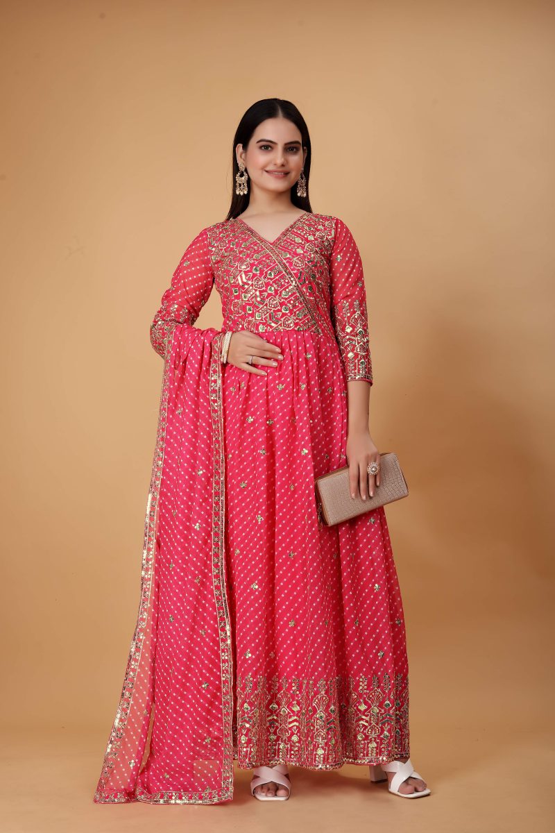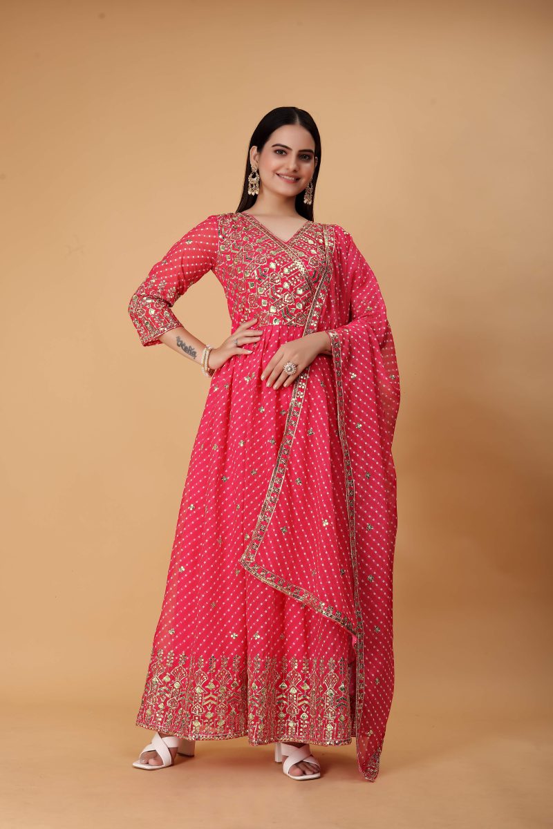 The world of fashion is ever-evolving, and one timeless piece that continues to captivate hearts is the pink georgette anarkali suit. This article delves into the exquisite details of this ensemble, designed to add a touch of grace and elegance to your celebrations.About the product :