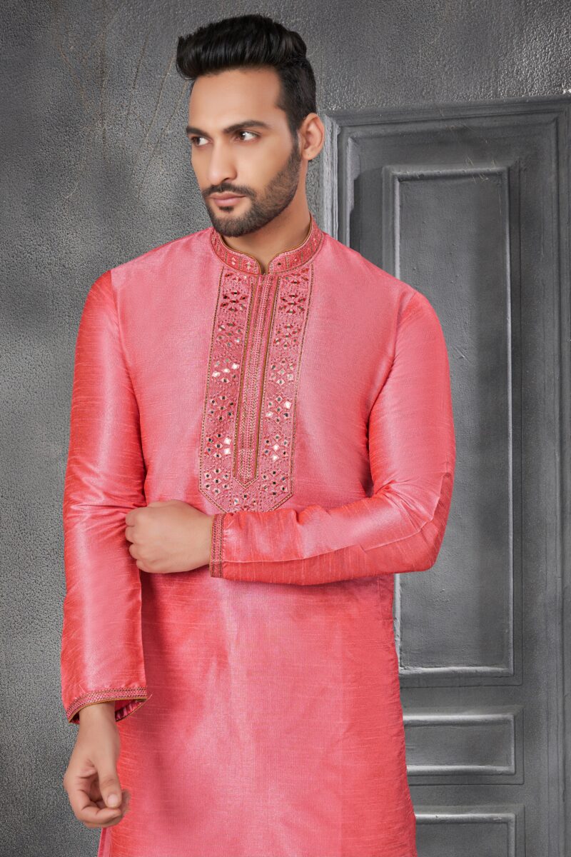 Pink kurta pajama for men: Exquisite Neck Embroidery with Mirror Style