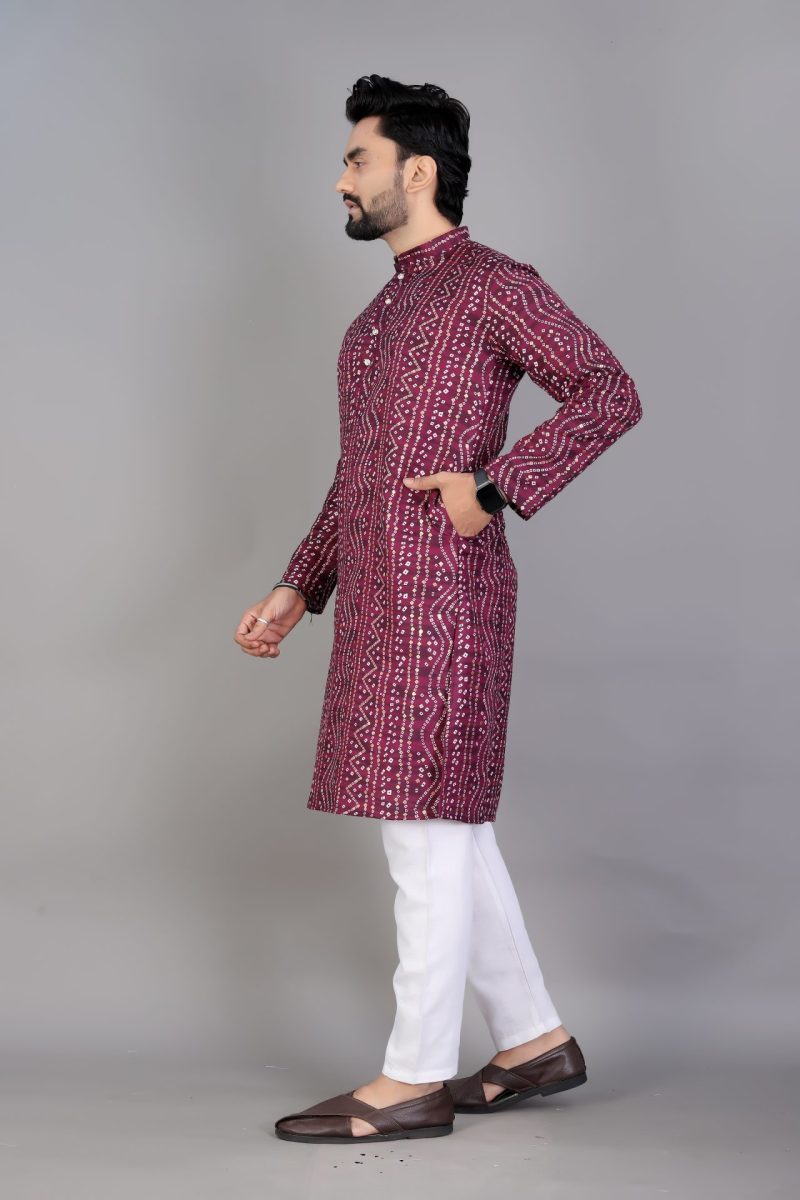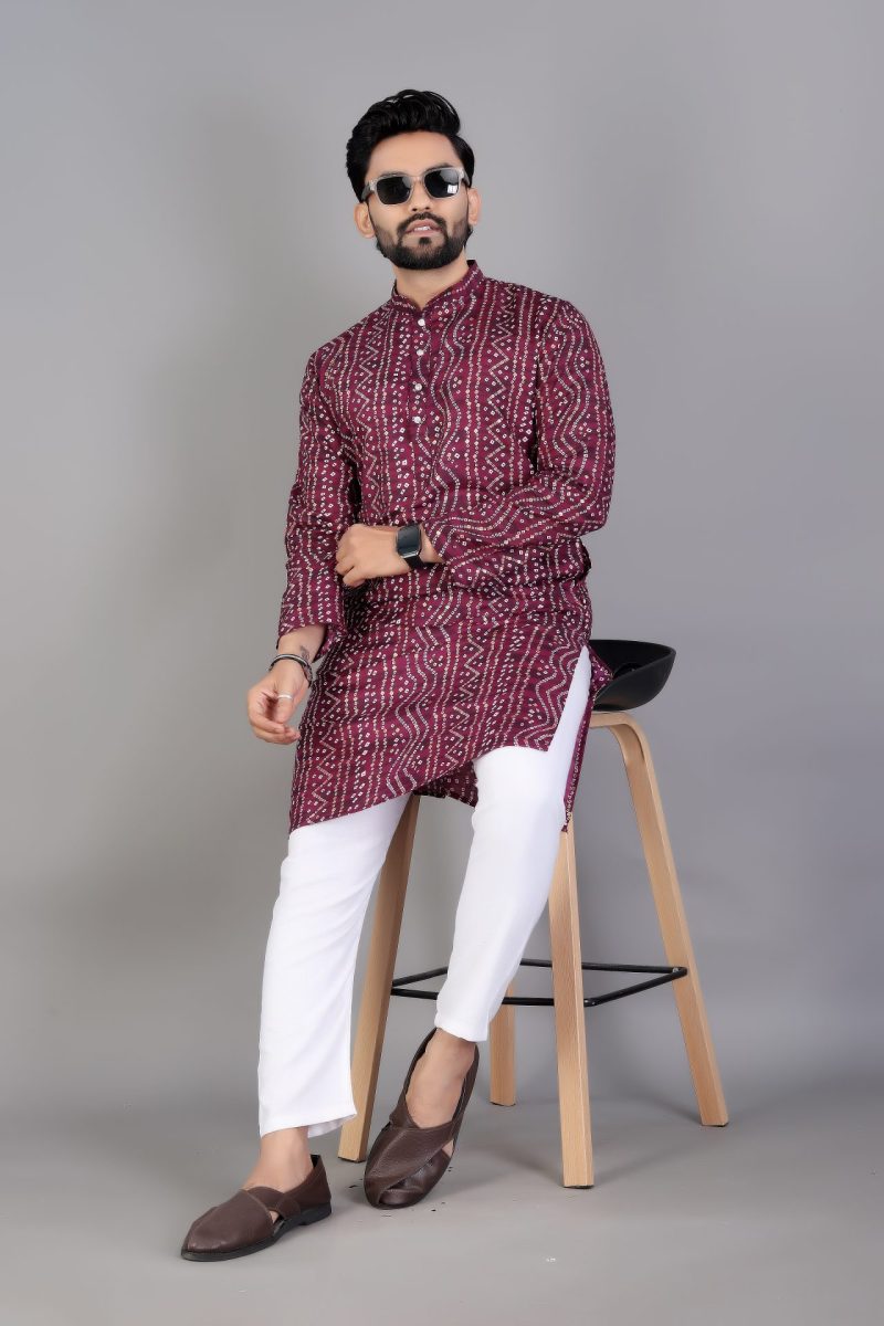 The Purple Bandhani Printed Kurta Pajama for men carries the essence of Indian tradition. Bandhani, a centuries-old tie-dye technique, symbolizes prosperity and joy. Worn during festivals and cultural gatherings, this attire beautifully reflects heritage with a contemporary edge.