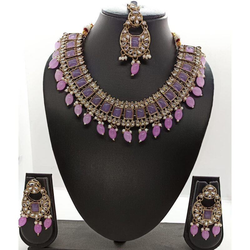 Purple Kundan Necklace With Earrings And MaangTikkaAvailability: 2 In Stock