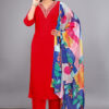 To complement the elegance of the suit, an abstract print dupatta accompanies it. The bold prints contrast beautifully with the solid red suit, adding a creative twist to your overall look. The dupatta’s light fabric makes it easy to drape, enhancing the suit’s visual appeal.Pairing Suggestions