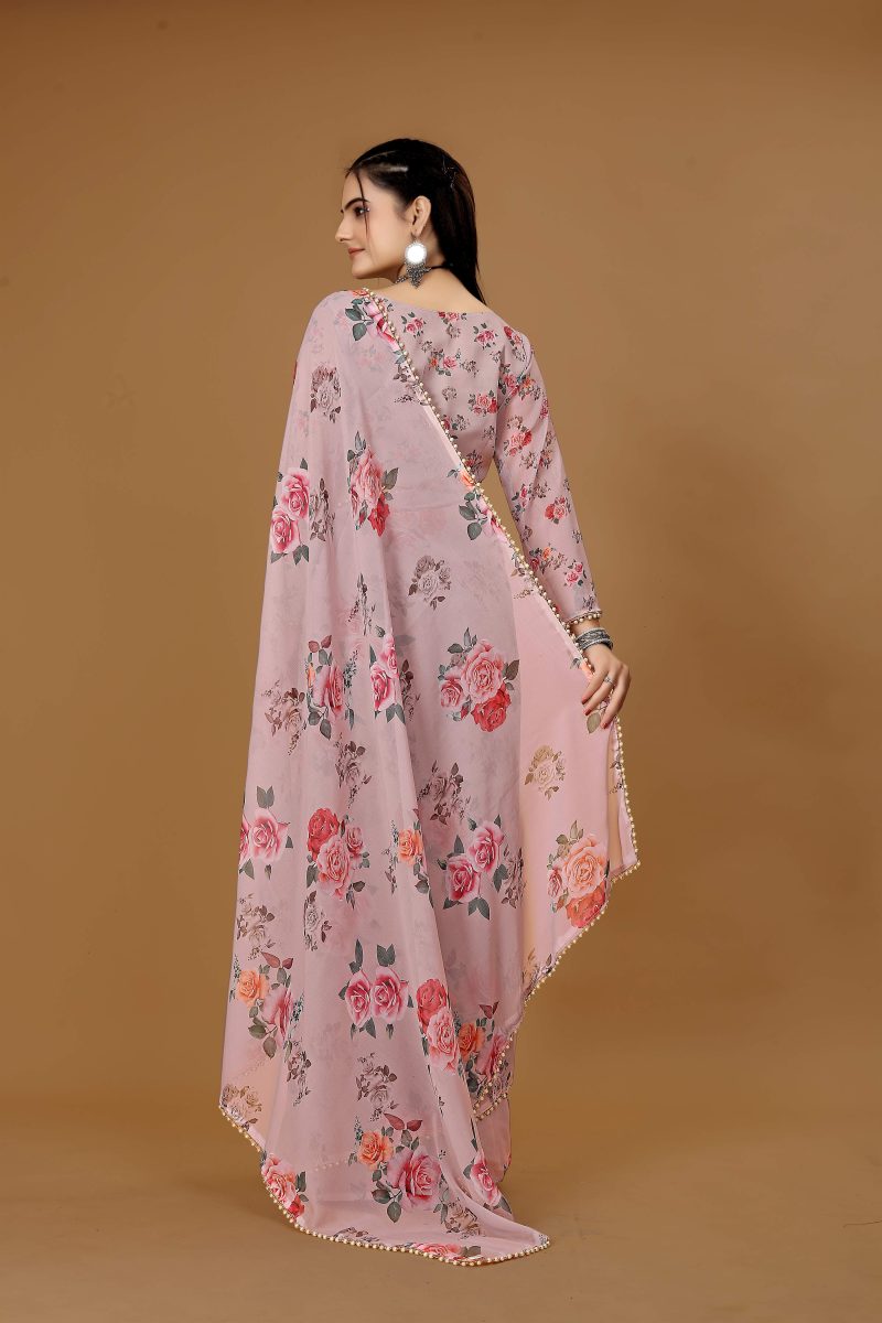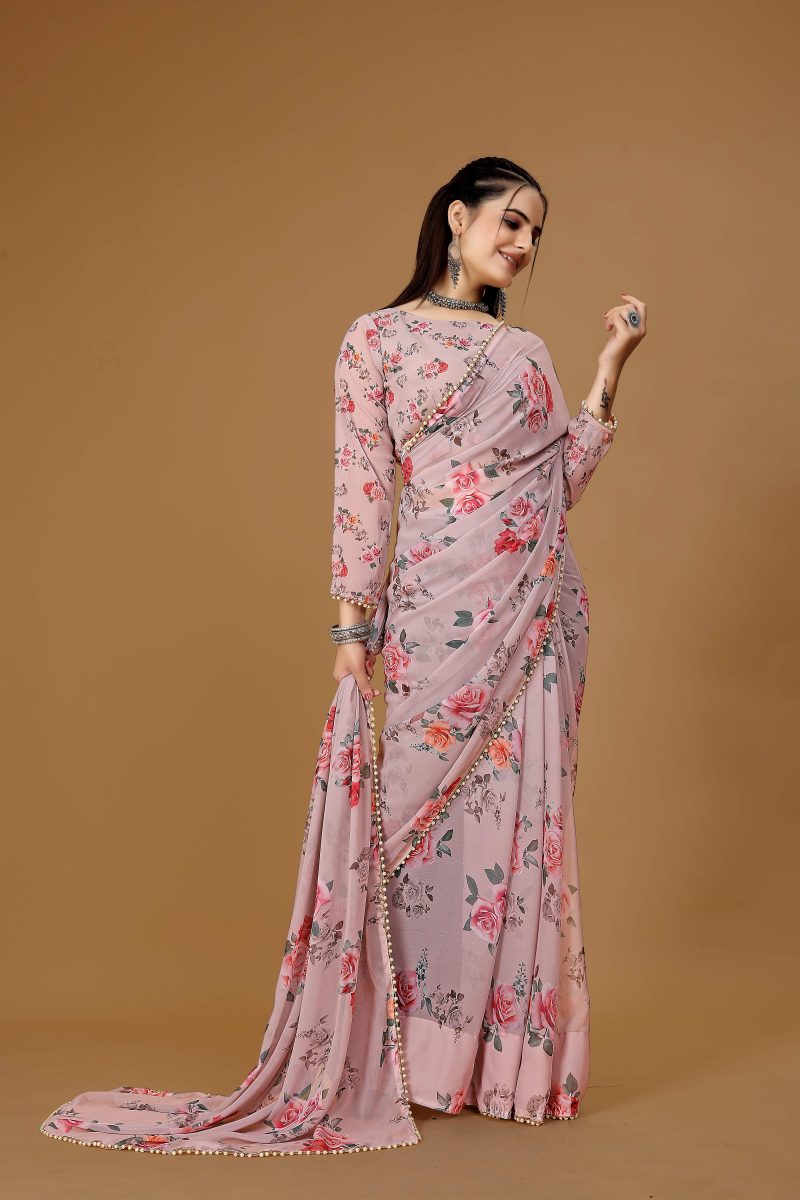 Unveil the enchanting allure of our Rose Floral Readymade Saree, a masterpiece that brings together the timeless elegance of Indian style and the grace of blooming roses. This exquisite saree boasts captivating rose floral patterns in vibrant hues, intricately woven to perfection. The luxurious georgette fabric drapes gracefully, enhancing your natural beauty with every step. The saree is adorned with a pearl lace border, adding a touch of sophistication that will make you stand out at any event. Key Features:- Luxurious rose floral patterns and pearl lace border exude elegance.