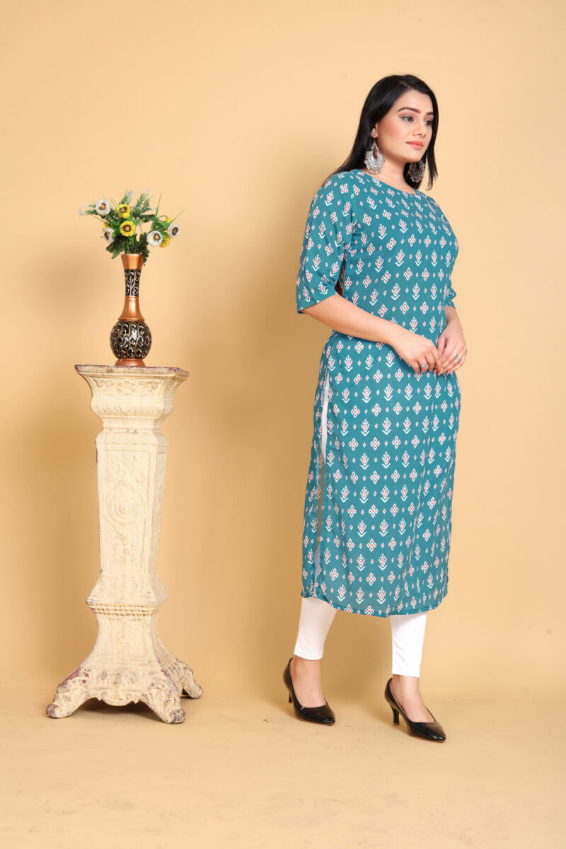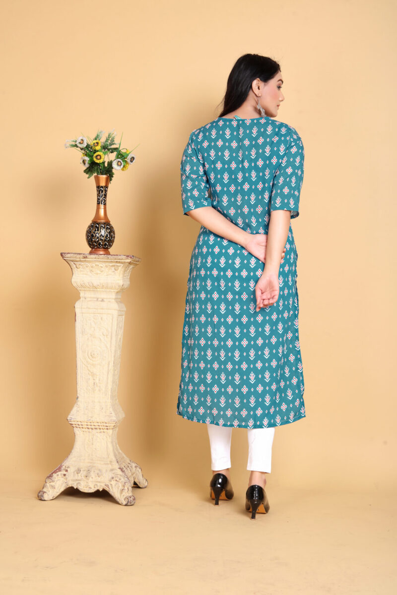 The calming teal shade symbolizes tranquility and harmony, aligning with the traditional Indian love for vibrant yet meaningful colors. The printed design adds a contemporary flair, making it a versatile choice for women who value tradition and modernity.Occasions to Wear the Teal Printed Cotton Kurti