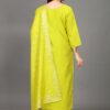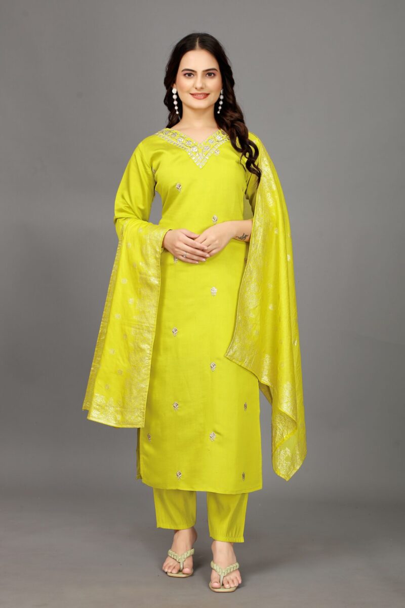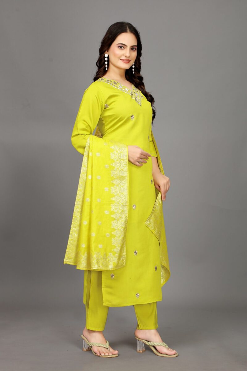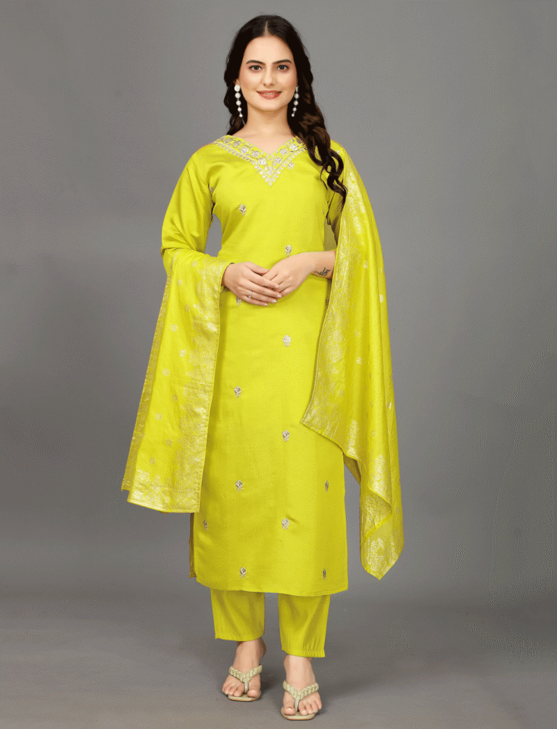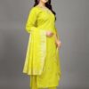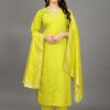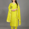 vibrant yellow shade, a color often associated with happiness, energy, and positivity. Yellow is a popular choice for festive and wedding wear, as it brings brightness and warmth to any event. The rich tone of this kurti set adds a modern flair while maintaining a traditional aesthetic.